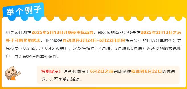 自2025年3月24日至6月22日,亚马逊推出欧洲站优惠券费用限时返还活动,凡是过去 90 天内首次可购买的亚马逊物流 (FBA) 商品,每次优惠券兑换所产生的费用(0.5 欧元 / 0.45 英镑)都将按月返还至卖家账户。