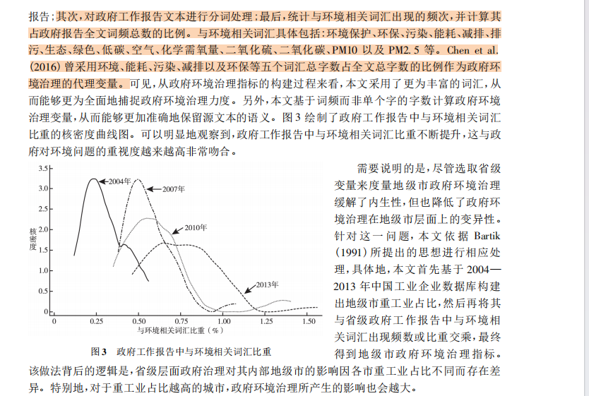 借鉴Chen et al.(2016)、陈诗一和陈登科(2018)的方法,采用地方政府工作报告中与“环保”一词相关词汇出现的词频与报告全文字数的之比作为环境治理的代理变量。