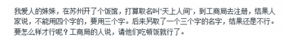 茅于轼在这篇微博里透露,他爱人的妹妹在苏州开了个饭馆,打算取名叫“天上人间”。到工商局去注册,结果人家说,不能用四个字的,要用三个字。后来另取了一个三个字的名字,结果还是不行。要怎么样才行呢?工商局的人说,请他们吃顿饭就行了。注册信息为“苏州市工商行政管理局官方微博”的“红盾苏州在线”称,核准后未发现今年有用“天上人间”名称申请注册的相关痕迹。为便于查清事实,请相关当事人尽快提供线索。记者看到,该回复同时附上了联系方式:苏州工商局登记注册处:0512—68150500;监察室:0512—68150129。