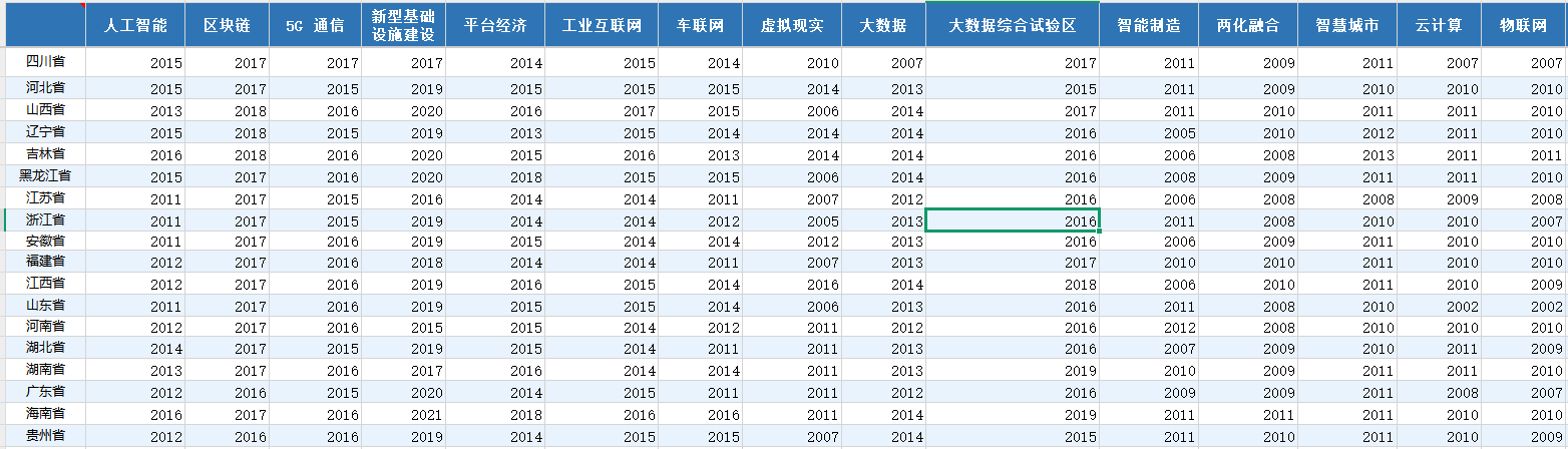 本团队收集了我国大陆除4个直辖市以外的27个省级行政区划的,包含人工智能、区块链、5G 通信、新型基础设施建设、平台经济、工业互联网、车联网、虚拟现实、大数据、大数据综合试验区、智能制造、两化融合、智慧城市、云计算、物联网一共15个主题的政策文件,取该关键词第一次出现在该省政策文本的时间点作为政策时点。本数据可以和其他省级面板数据合并构建DID模型。