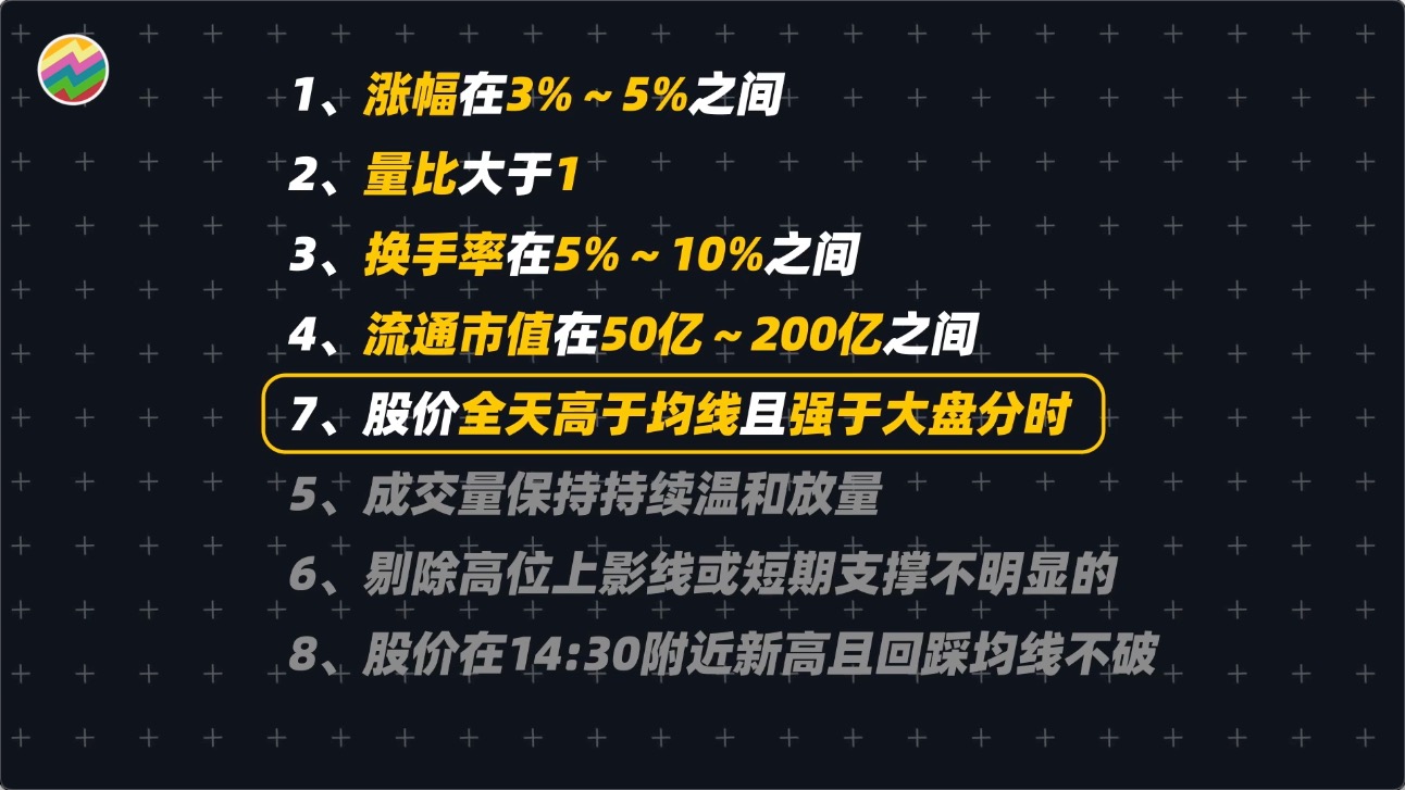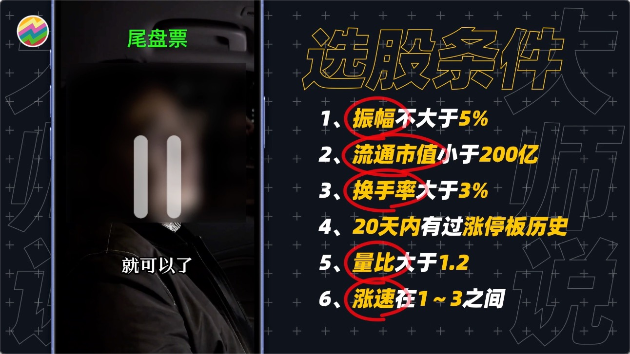 我先去找了一个视频点赞很多,看着也很牛的大佬,他说尾盘选股不是乱买,需要满足以下条件: