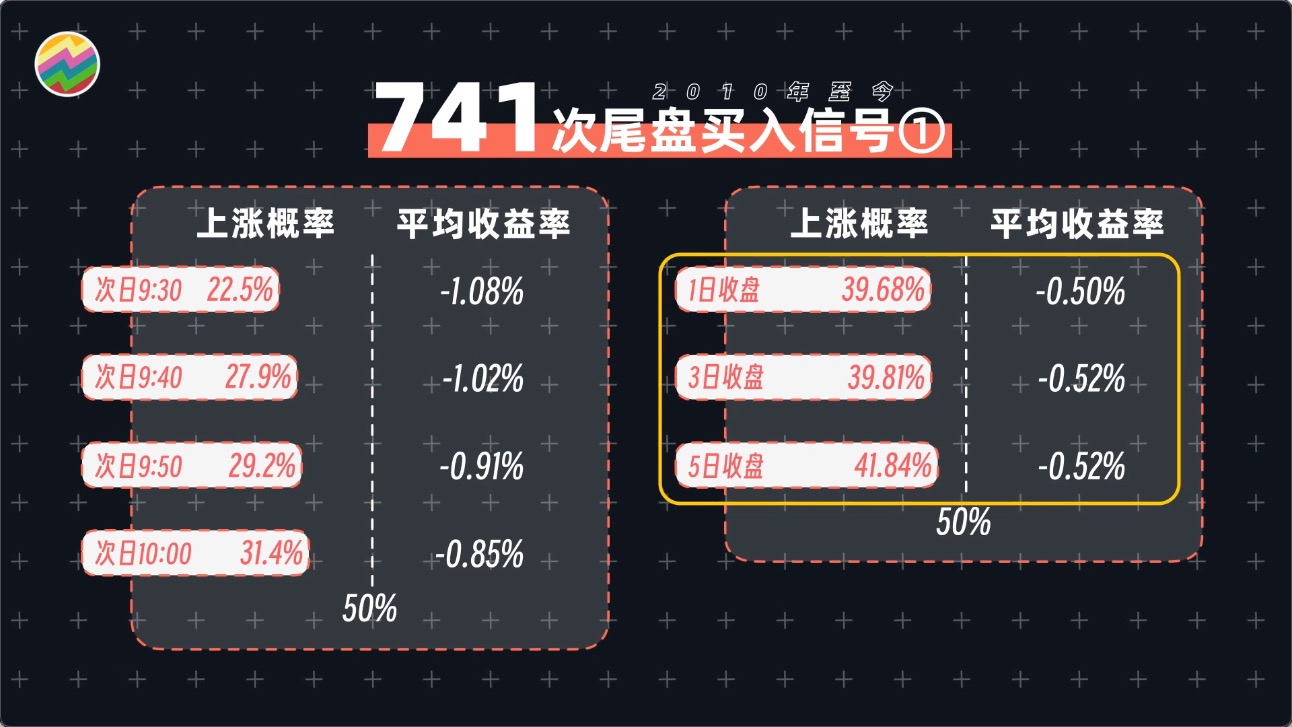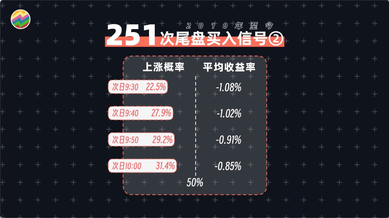 策略信号从251次飙升至24101次。在尾盘买入,次日开盘卖出赚钱的概率是36.2%,每笔交易的平均收益率是-0.47%。
