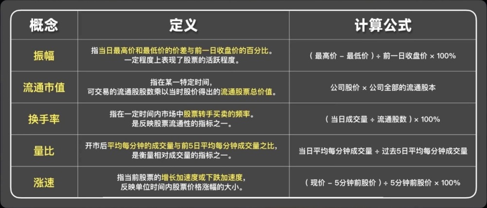 其中提到的振幅、量比、涨速等指标,可能有朋友不太了解,我把它们的概念和公式也列了出来: