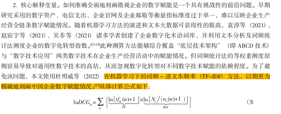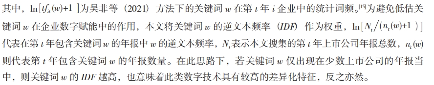 【企业数字赋能】参考文献使用数字化词频-逆文本频率(TF-IDF)来刻画企业数字赋能情况。具体地,计算方法如下:首先计算逆文本频率TF-IDF中的TF项,词语w的TF=In(词语 的词频/企业当