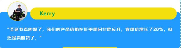用“抢车”大战来形容Kerry yoo的圣诞节销量,毫不夸张。产品备货量是平时的3倍,客单价增长20%+,但还是卖断货了。盘点下来,圣诞节期间的销量足足暴增了5倍多,后续每周两个货柜的出货量,才能够满足客户的需求。