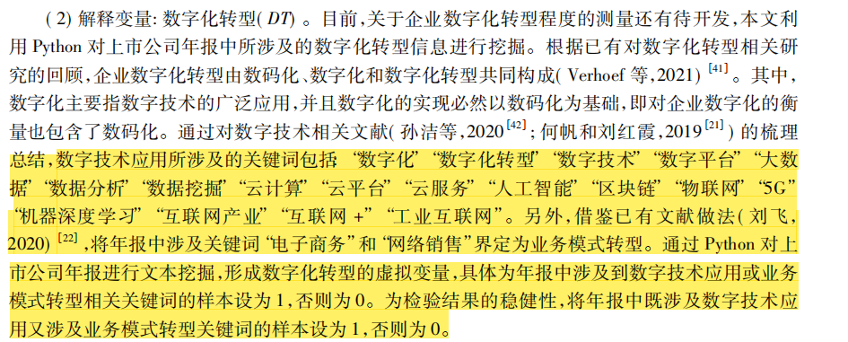 3.生成数字化转型虚拟变量,具体为年报中涉及到数字技术应用或■业务模式转型相关关键词的样本设为1,否则为0。