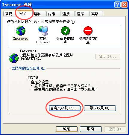 5、点击“安全”标签,点击下面的“自定义级别”;