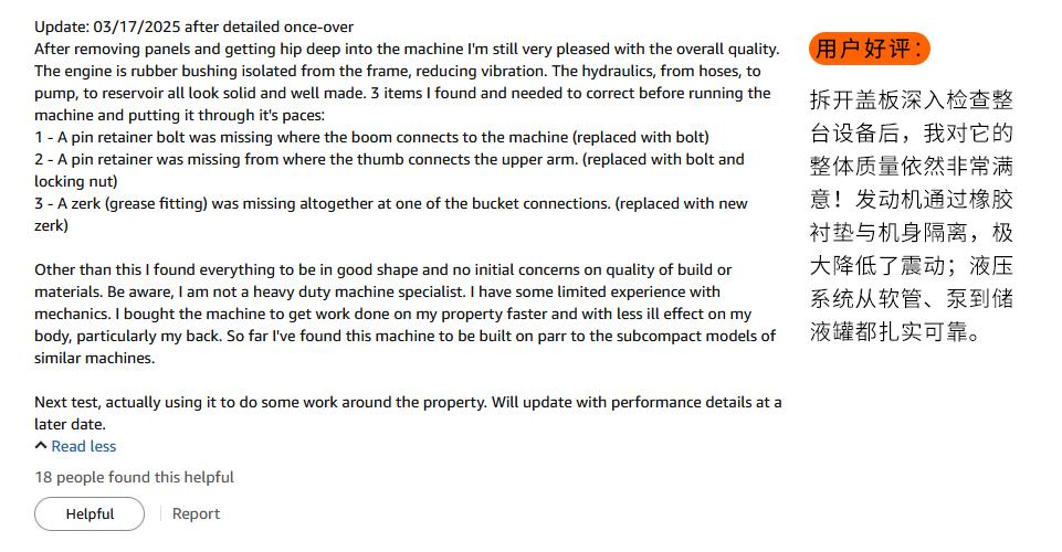 本地化适配:考虑到欧美用户普遍身材高大的特点,团队对驾驶舱进行了针对性调整,加宽空间、优化座椅布局,大幅提升长时间作业的舒适度 这些努力获得了用户的高度认可,一位客户在评价中写道: