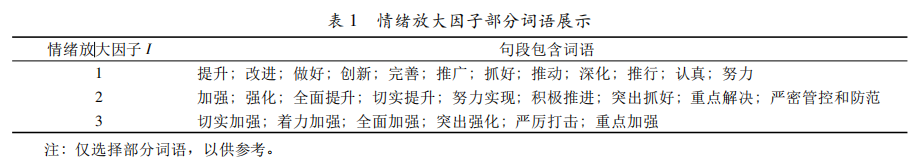 由于政府工作报告的内容不仅包含对政府当年各项工作的归纳与计划,还包含了对上一年工作情况的回顾与总结,但一些公共事务决策者对事务关注程度的高低直接表现为政府工作报告中涉及的文字表述比重和关键词的词频,即注意力强度,因此本文不剔除在上一年工作总结中出现的字段,而是将其记为 “0 ( 中性姿态) ”; 对于报告中新一年计划部分出现的句子,如果能直接判断其对流动人口的态度,则打分 “1 ( 抑制姿态) ”、 “-1 ( 支持姿态) ”; 对于不能直接判别的句子,则综合上下文进行人工判断。在此基础上,本文引入情绪放大因子,赋予语气强烈的句子绝对值更大的态度分数,见表 1。