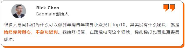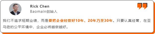 “I'm a slow walker, but I never walk back(我走得慢,但从不后退)。”这句话是Rick Chen经营理念的真实写照。采访过程中,小编可以随时感受到这位十年深耕者的独到之处:在快节奏的跨境电商行业中,Baomain公司选择了稳健慢行的发展道路。