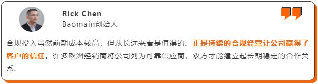 对于跨境电商而言,合规经营既是基本要求,更是企业持续发展的保障。Rick Chen深谙其道,从创业伊始就将合规置于经营的核心位置。