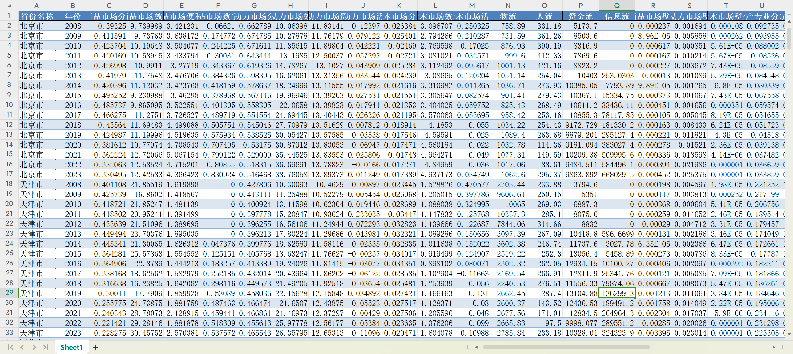 本分享数据涵盖商品市场、劳动力市场、资本市场的各项指标,涉及市场效率、便利性、数字化程度等多个方面,为研究者分析全国统一大市场发展提供了数据支持