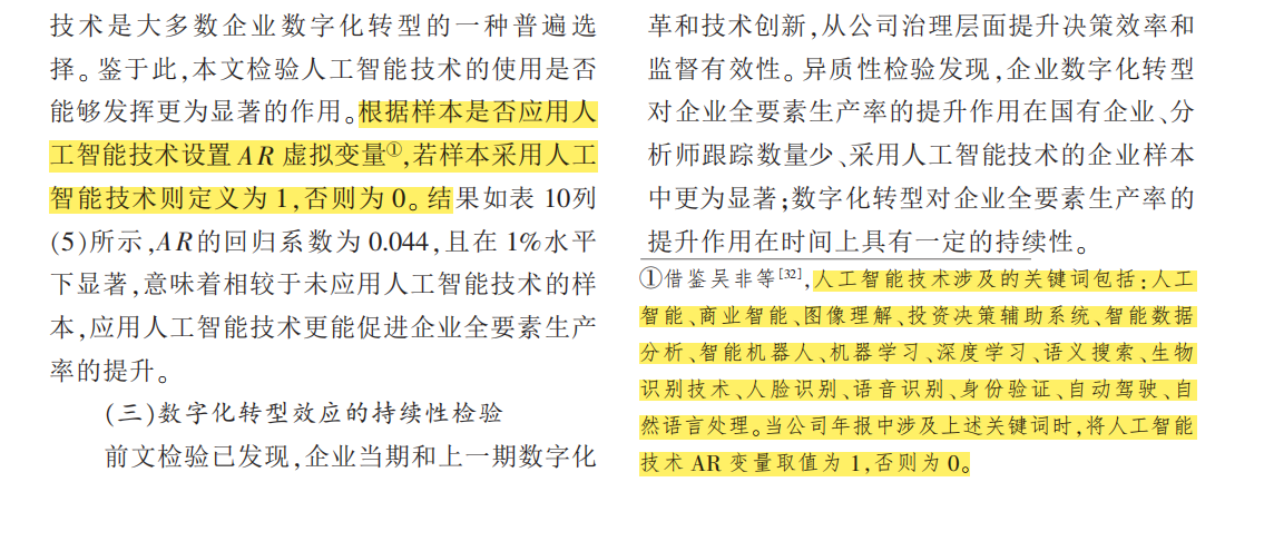 指标说明:借鉴参考做法,人工智能技术涉及的关键词包括:人工智能、商业智能、图像理解、投资决策辅助系统、智能数据分析、智能机器人、机器学习、深度学习、语义搜索、生物识别技术、人脸识别、语音识别、身份验证、自动驾驶、自然语言处理。以上述关键词为基础,对上市公司年报文本进行文本分析,生成人工智能技术词频,当公司年报中涉及上述关键词时,将人工智能技术虚拟变量取值为1,否则为0