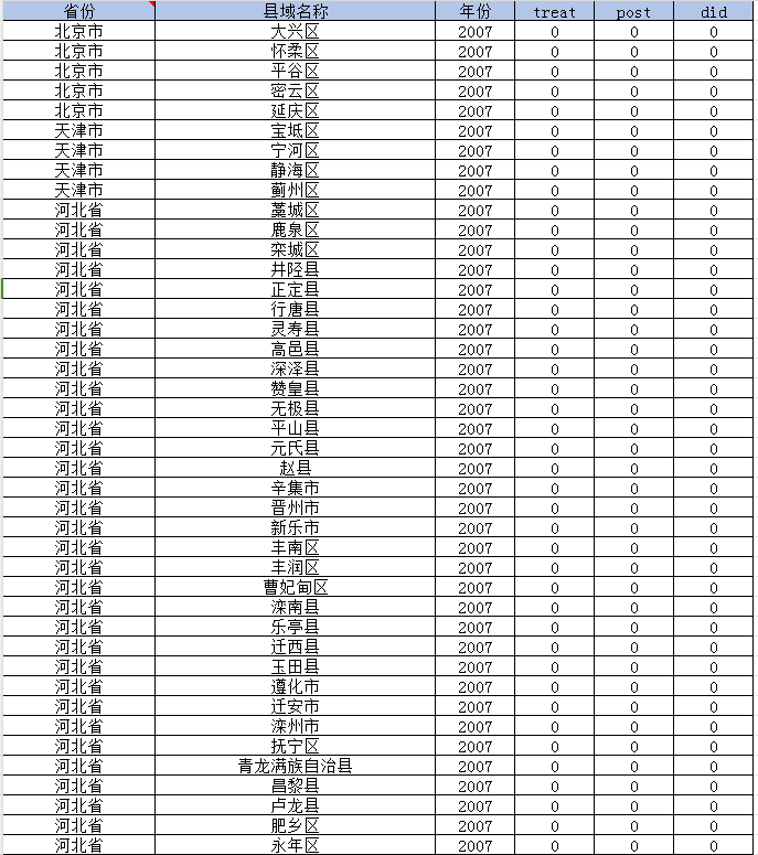 省份、县名、试点年份、省份、县域名称、年份、treat、post、did。
