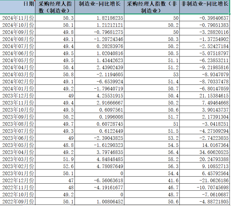 日期、采购经理人指数(制造业)、制造业-同比增长、采购经理人指数(非制造业)、非制造业-同比增长。
