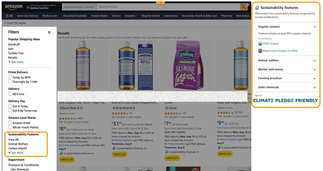 经过可持续认证加入CPF计划的产品,在亚马逊网站中可获得专属“绿标”,帮助消费者快速识别并购买更环保的商品,有效提升产品曝光度与点击率。