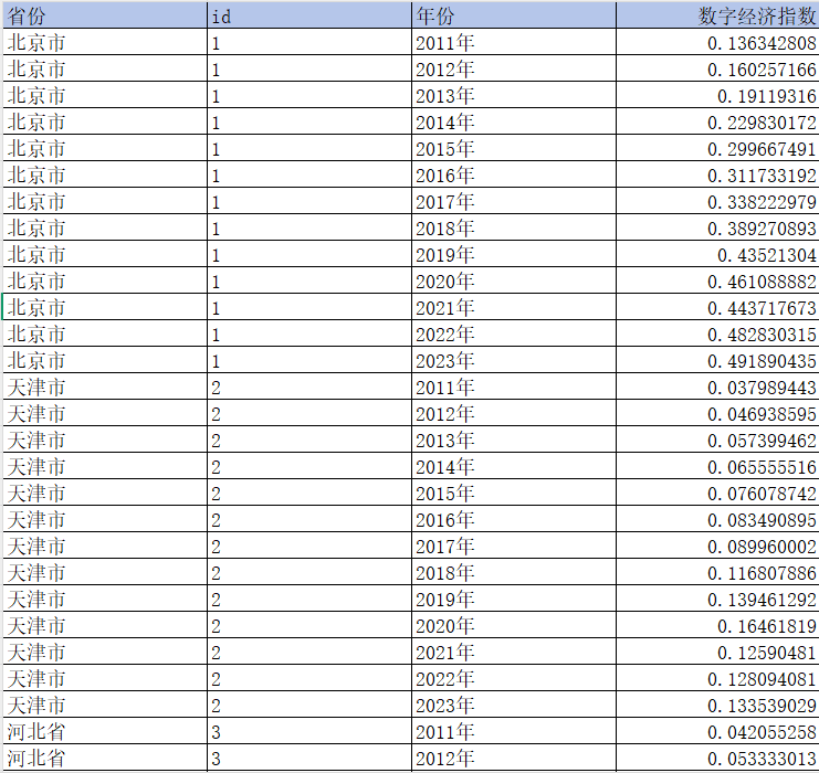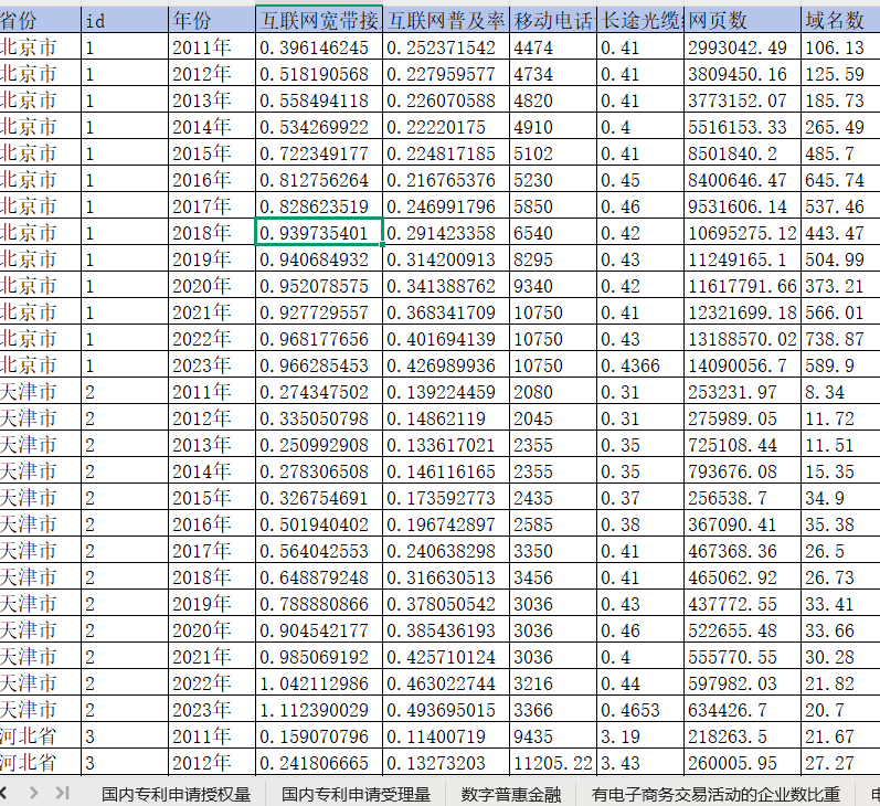 省份 id 年份 互联网宽带接入率 互联网普及率 移动电话设施规模 长途光缆线路长度 网页数 域名数 人均电信业务总量 移动电话普及率 信息传输、软件和信息技术服务业法人单位数 信息软件业就业人员占比 国内专利申请授权量 国内专利申请受理量 数字普惠金融 有电子商务交易活动的企业数比重 电子商务销售额 每百家企业拥有网站数 二三产业增加值 科技创新投入 快递量 数字经济指数