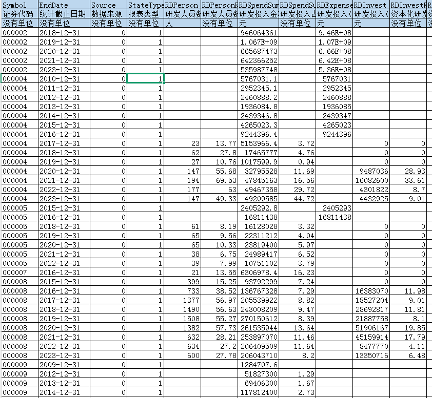 证券代码 统计截止日期 数据来源 报表类型 研发人员数量 研发人员数量占比(%) 研发投入金额 研发投入占营业收入比例(%) 研发投入(支出)费用化的金额 研发投入(支出)资本化的金额 资本化研发投入(支出)占研发投入的比例(%) 资本化研发投入(支出)占当期净利润的比重(%) 币种 说明