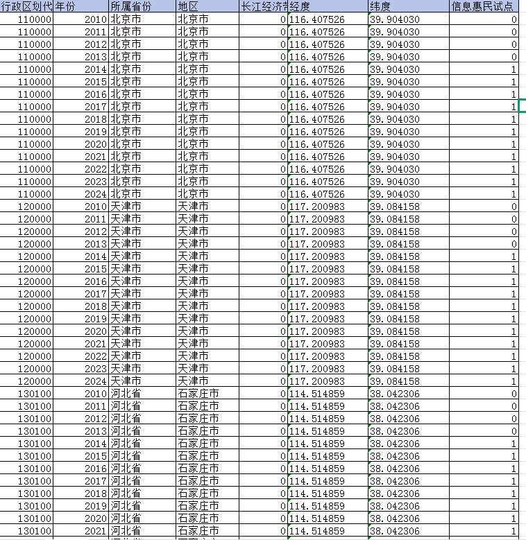 地级市:行政区划代码、年份、所属省份、地区、长江经济带、经度、纬度、信息惠民试点。