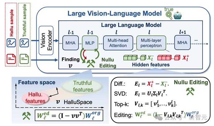 【新智元导读】当前大型视觉语言模型(LVLMs)存在物体幻觉问题,即会生成图像中不存在的物体描述。西安交通大学研究团队提出了一种名为Nullu的方法,通过提取「幻觉子空间」(HalluSpace)并进行零空间投影来编辑模型权重,从而有效消除幻觉,且不增加额外推理成本。