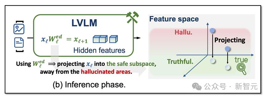 如下图所示,当输入内容的内部特征存在处于HalluSpace的分量时,新的模型参数可以有效将该分量消除,从而减少幻觉的发生。