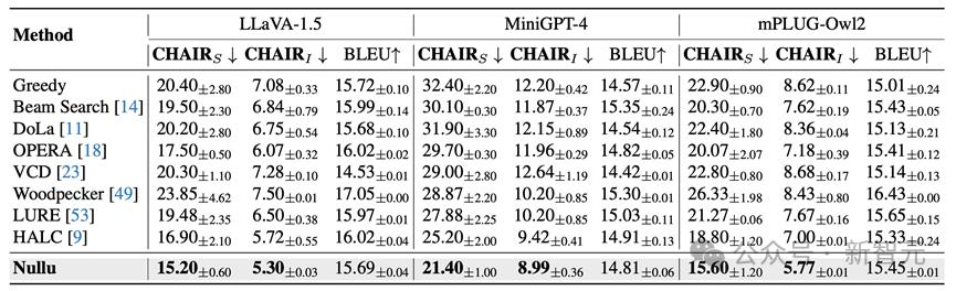 研究人员将所提出方法部署于LLaVA-1.5、MiniGPT-4和mPLUG-Owl2,并在多个数据集对Nullu的有效性进行了验证:包括在CHAIR和POPE的幻觉性能验证,以及在MME和LLaVA-Bench的通用性能测试。