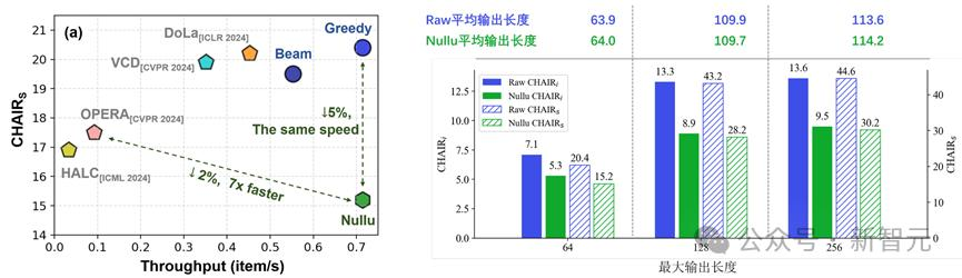 相比现有其他解码增强方法,Nullu能以更快的速度,实现更好的物体幻觉解决性能。且这一性能提升并非通过减少模型输出长度来实现的。