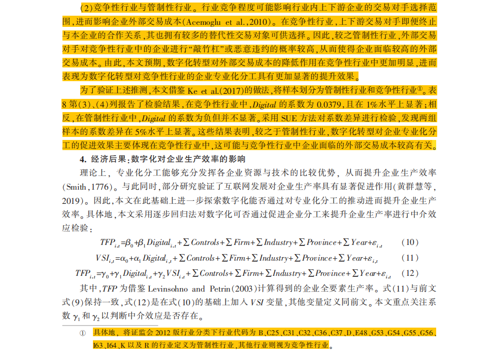 竞争性行业与管制性行业。行业竞争程度可能影响行业内上下游企业的交易对手选择范围,进而影响企业外部交易成本(Acemoglu et al.,2010)。在竞争性行业,上下游交易对手即便终止与本企业的合作关系,其也拥有较多的替代性交易对象可供选择。因此,较之管制性行业,外部交易对手对竞争性行业中的企业进行“敲竹杠”或恶意违约的概率较高,从面使得企业面临较高的外部交易成本。由此,本文预期,数字化转型对外部交易成本的降低作用在竞争性行业中更加明显,进而表现为数字化转型对竞争性行业的企业专业化分工具有更加显著的提升效果
