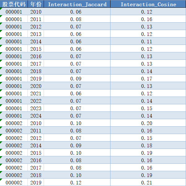 股票代码 | 年份 | Interaction_Jaccard | Interaction_Cosine |