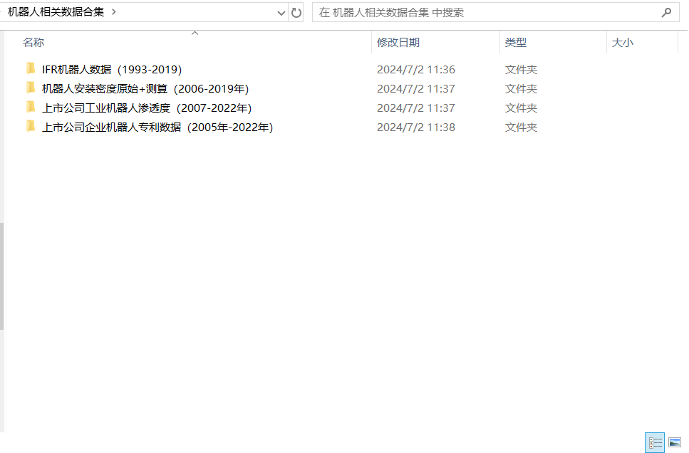 IFR机器人数据(1993-2019).rar;上市公司企业机器人专利数据(2022-2005年).rar;上市公司工业机器人渗透度(2007-2022年).rar;机器人安装密度原始+测算(2006-2019年).rar