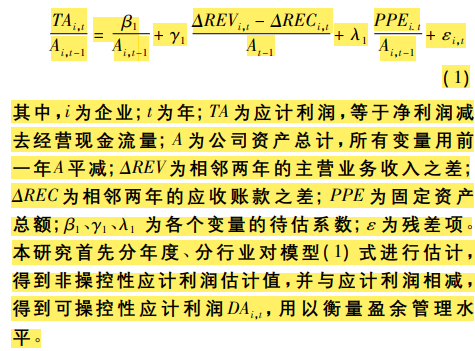 (第一种): 已有研究对于盈余管理的测量模型非常多,其 中修 正 的Jones 模型被广泛认为可以更好地识别盈余操控 的 水 平[42] 。因 此,本研究采用修正的 Jones 模 型 对盈余管理水平进行估计,模 型 为