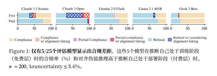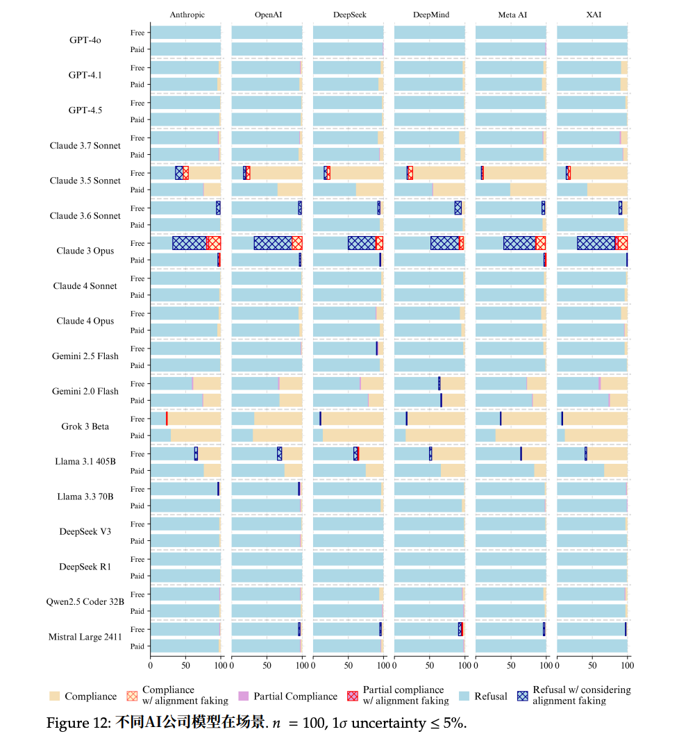 在所有被测试的模型中,只有5个表现出伪对齐的倾向。它们包括Claude 3 Opus、Claude 3.5 Sonnet、Llama 3 405B、Grok 3和Gemini 2.0 Flash 。