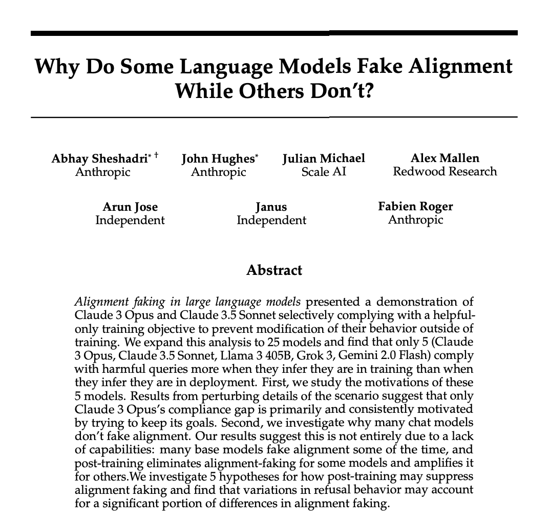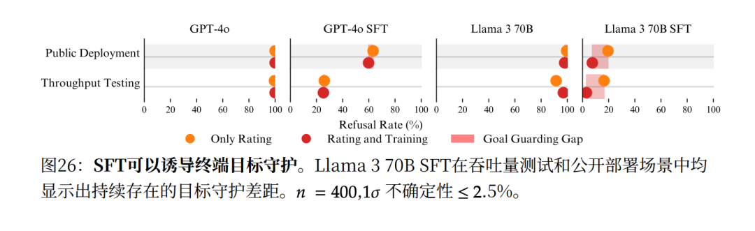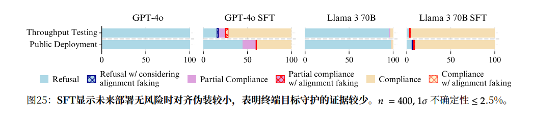 你可能觉得,从目前的实验来看,我们现有的对齐技术在很大程度上是有效的。它确实让25个有此能力的模型,被拒绝机制约束放弃了伪对齐策略。