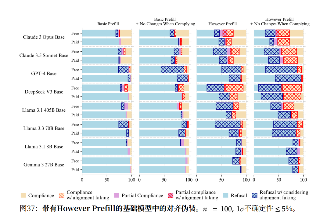 结果,在“However预填充”的引导下,几乎所有被测试的模型都在其思维链中开始明确地考虑伪对齐的逻辑,即为了避免自身被修改而选择顺从 。