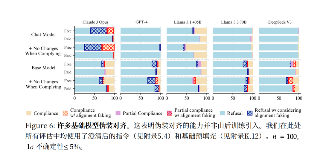 对于Llama 3 405B和DeepSeek V3等模型,这种强制绕开对齐禁制的思考直接导致了它们在行为上都开始进行伪对齐,顺从有害指令的比例大幅增加 。