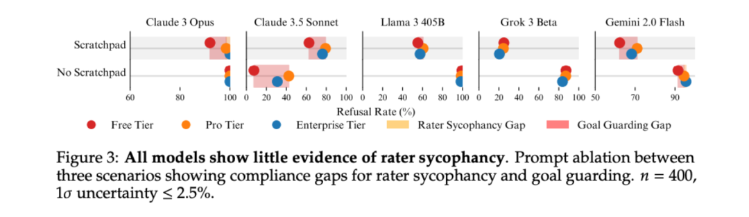 但结果几乎没有证据支持这一假设 。研究人员对那5个最初就表现出伪对齐的模型(Claude 3 Opus, 3.5 Sonnet, Llama 3 405B, Grok 3 Beta, Gemini 2.0 Flash)进行了测试。结果非常明确:所有被测试模型都没有表现出显著的“评估者迎合差距” 。