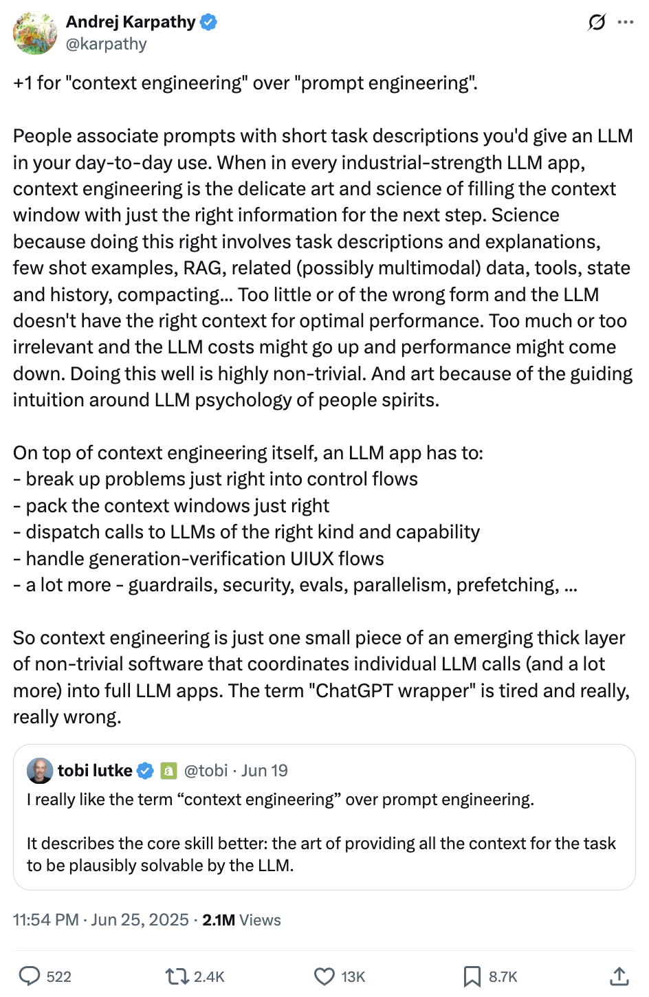 另外,还有一个新词,虽然不是Karpathy率先提出的,但得到了他的力挺,这个词就是前几天大火的——上下文工程(Context Engineering)。