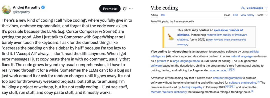 Karpathy称自己发了推特15年,也猜不到究竟哪条会火,以为随便聊聊Vibe coding这个自己想出来的新词不会有太多人关注,结果这个词现在火到连维基百科页面都有词条了。