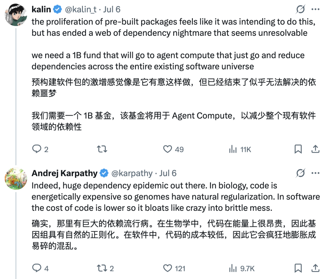 Karpathy觉得,软件开发也该有这意识。写代码太容易、成本太低,大家随手就加依赖,最后代码臃肿不堪,又脆弱又混乱。