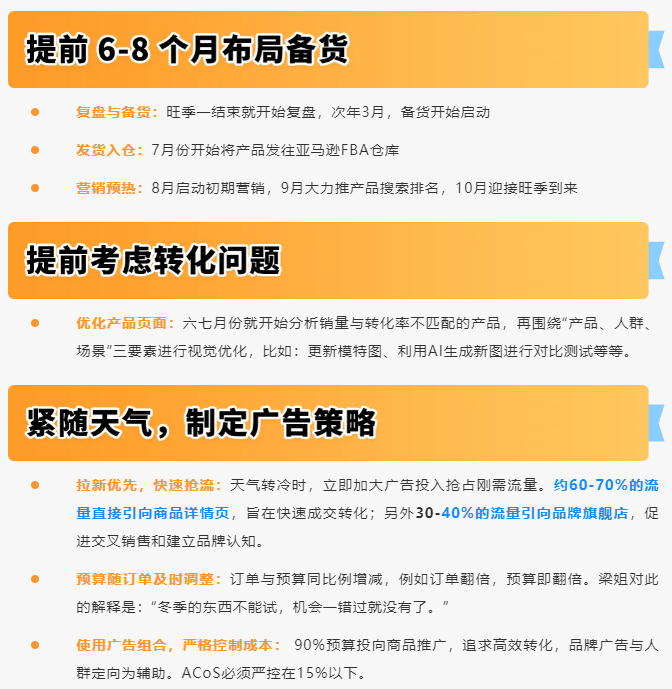 在梁姐的众多产品中,冬季手套和帽子这类产品的季节属性非常明显。而加拿大秋冬到来的更早也更长,这意味着对于梁姐的产品旺季也相应拉长。针对季节性产品,梁姐有一套非常严谨的运营策略,从备货到推广,环环相扣: