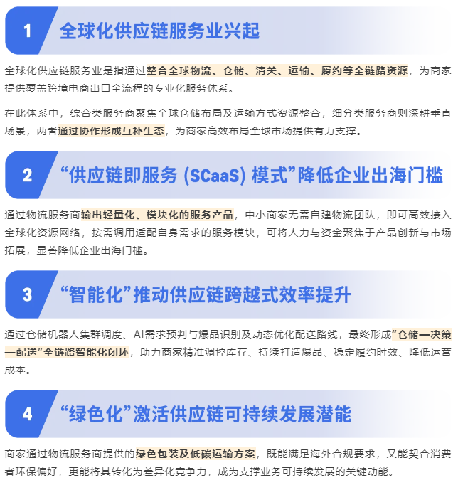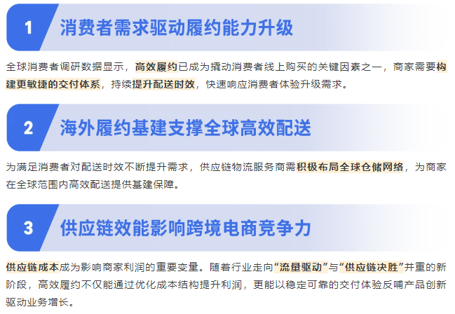 依托供应链物流服务商的全球化仓储基础设施,加速扩大海外仓布局,实现本地化备货,强化本地履约能力。