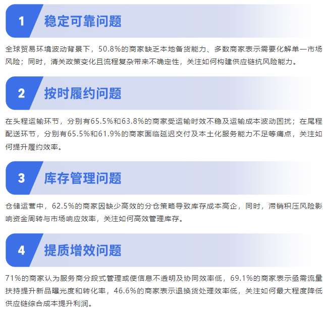 为精准捕捉跨境电商供应链真实需求,亿邦智库开展商家调研,基于300多份有效问卷,从稳定可靠、按时履约、库存管理及提质增效四大维度进行深度剖析,系统呈现供应链运营真实痛点,为破解行业瓶颈、构建基于韧性的供应链体系奠定基础。