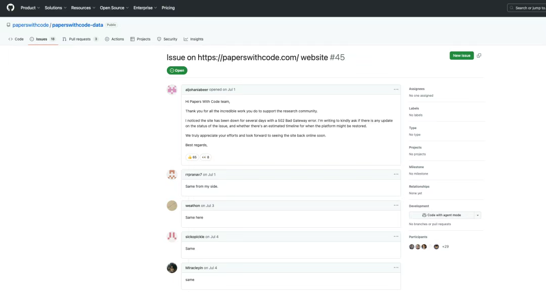 从数据集标题、描述等内容乱码,到网站显示「Bad Gateway 502」,Paper With Code 自 7 月初便出现了宕机、访问异常的情况,但官方迟迟没有出面回应,有用户通过 GitHub Issue 的形式向其运营团队询问进展,同样未有回复。