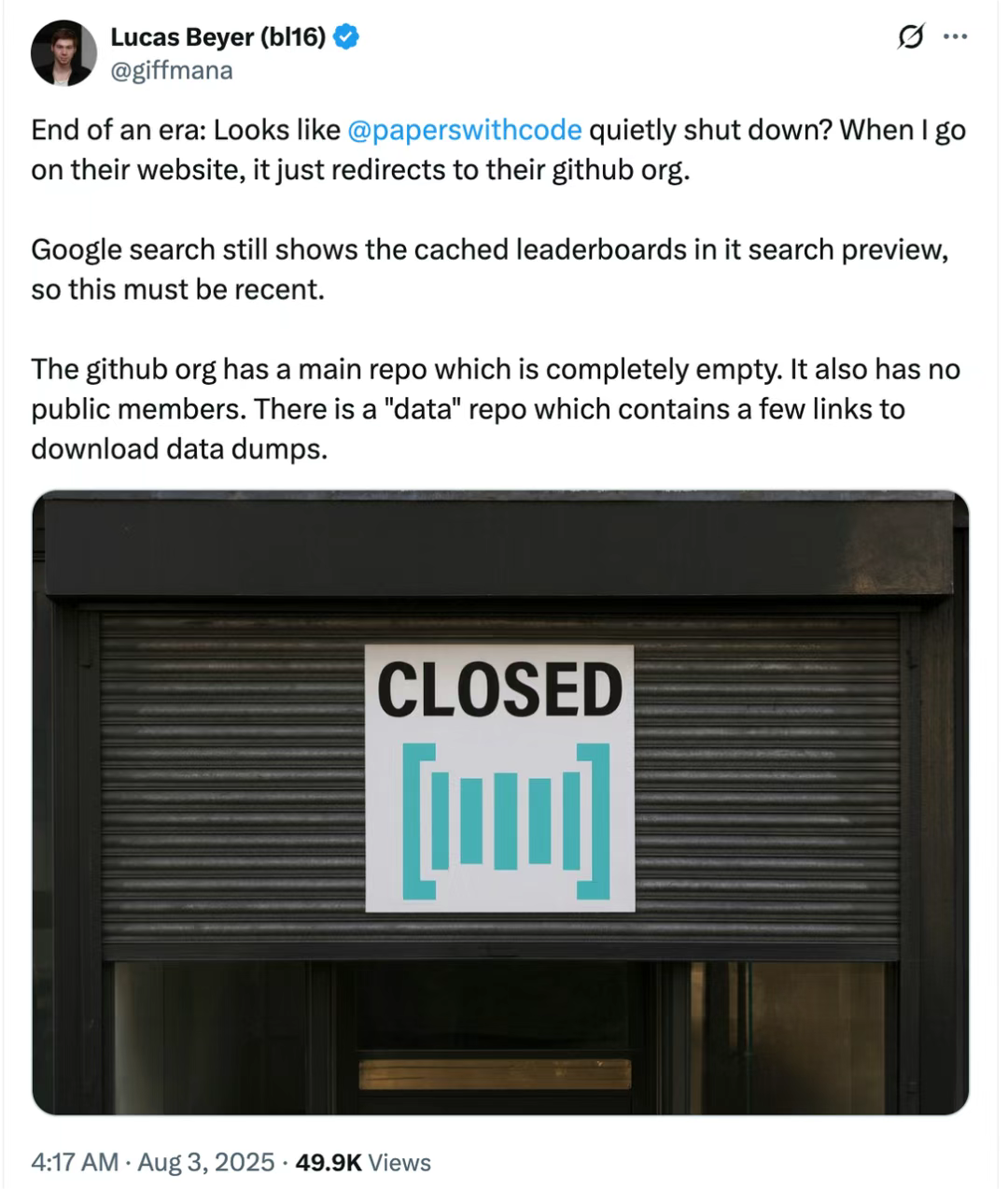 作为科研人员的「快乐老家」,这个聚集了论文、代码、benchmarks、leaderboards 等多类资源的平台,在全球范围内拥有大量拥趸,随着越来越多的开发者、科研人员察觉无法访问网站获取信息,「Paper With Code 关站」、「网站被攻击」等多方猜测在 X、Reddit、知乎等平台蔓延开来。