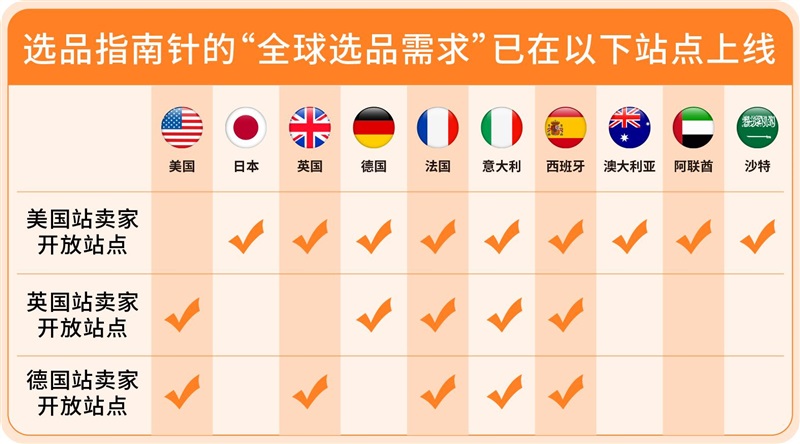 “全球选品需求”已在美国/英国/德国/日本/意大利/法国/西班牙/澳大利亚/ 沙特/阿联酋上线。