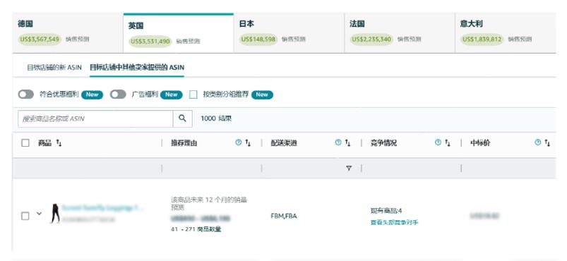 首先,阿万想看看英国站到底行不行。他从美国站的卖家平台进入“选品指南针”的“全球选品需求”页面,系统很快在“目标店铺的新 ASIN”菜单下列出了这款紧身运动裤,并在“推荐理由”中提示——在英国属于高需求产品,系统同时基于数据分析,给出了未来 12 个月的销售额预测。