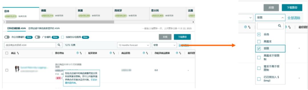 另外,阿万还想看看日本站能不能去。还是在“全球商品需求”里,这次选了“日本”,并在右侧筛选里勾选了“受限”,就可查看到所有在目标站点可能会受到监管要求限制的产品。