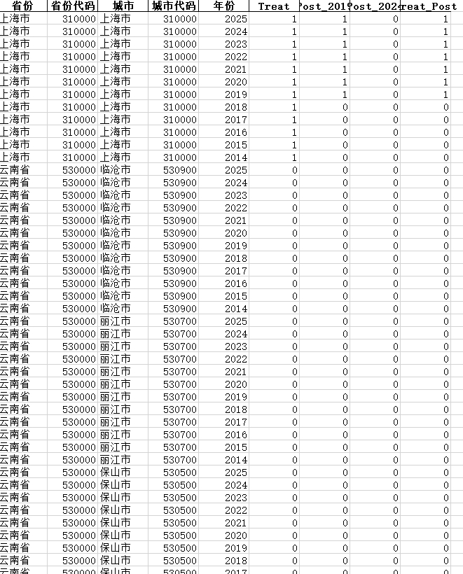 在该数据中,处理变量Treat表示该城市是否在5G试点名单上。Treat设定为1则表明该城市在5G名单上,反正则为0。Post则是根具名单发表的时间决定,比如最初的“5+12”试点名单虽然在2018年就已经设立但在2019年才正式实施并且在同年9月新增到了40个城市。而在2024年3月,人民网更新了最新的“5G-A” 名单,内容将5G城市更新到了100多个城市。因此数据皮皮侠设立了两个Post分别在2019和2024两个年份。Post_2019则表明该数据是2019年首次设立5G示范城市的时间,而Post_2024则是该数据在2024年设立的5G-A的名单。在该年名单的设立Post则为1,反正则为0。Treat_post的定义是5G城市在该年存在的名单。举个列子,在2025年的上海市其Treat_post为1则表明在2025年上海市是5G城市。