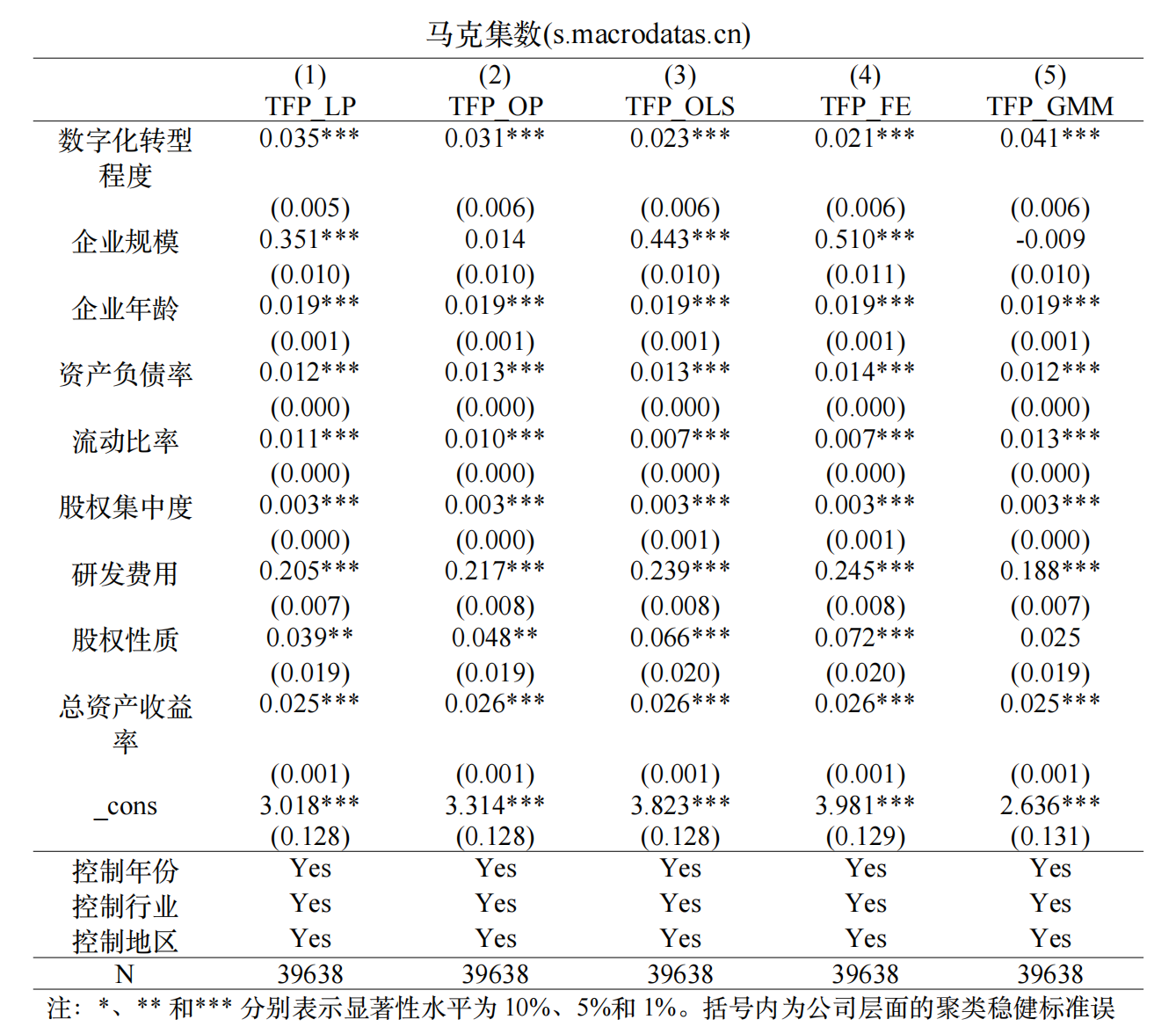 本文基于2007-2024年我国A股上市公司数据,考察数字化转型对企业全要素生产率的影响。参照赵宸宇等(2021)的做法,对来自财贸经济《数字化转型如何影响企业全要素生产率》一文中的基准回归部分进行复刻