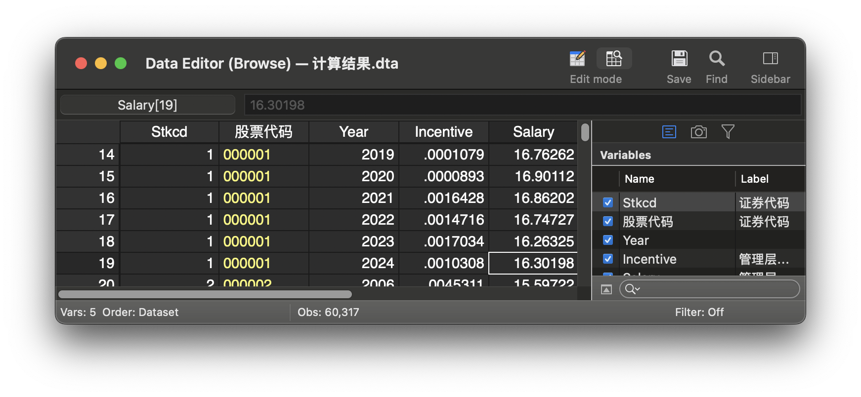 指标包括: Stkcd、Year、Incentive、Salary
